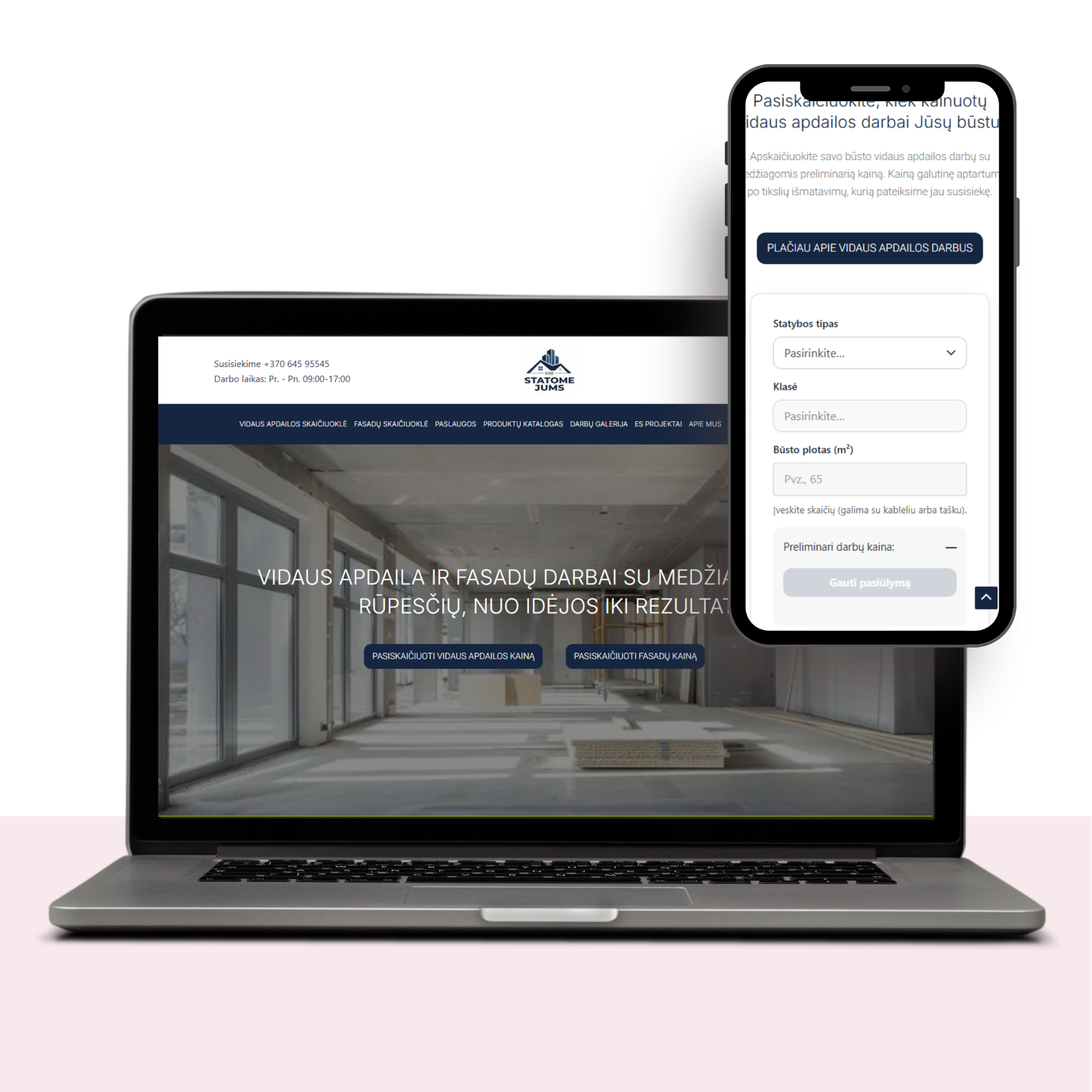 Internetinis statybų įmonės puslapis, kuriame galima apsiskaičiuoti fasadų ir vidaus apdailos darbų kainas ir nusiųsti užklausą.